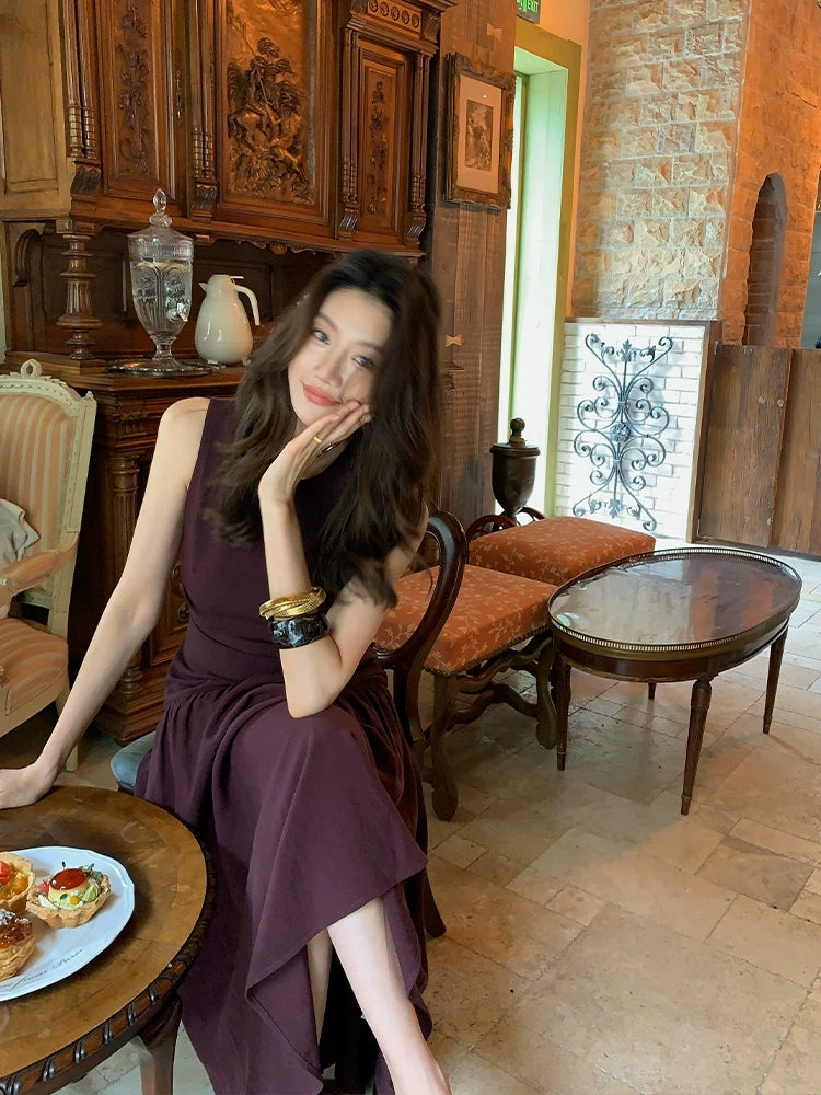 Summer Daily Leisure Tencel Linen Dress Women's Summer Wrinkled Waist for slimming and high-end feeling Sleeveless Medium length Skirt