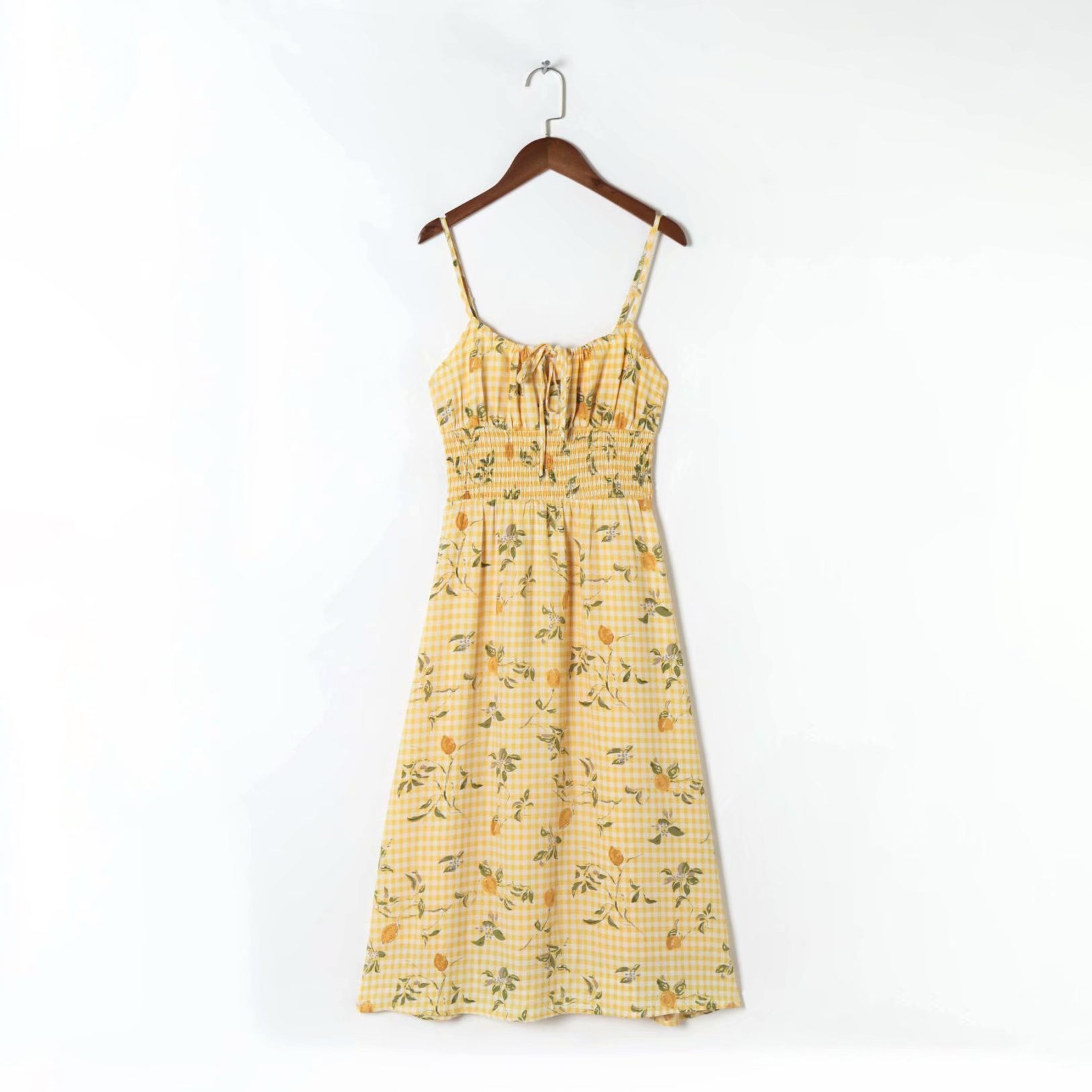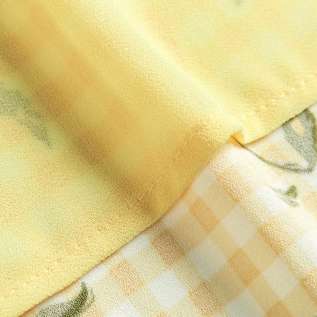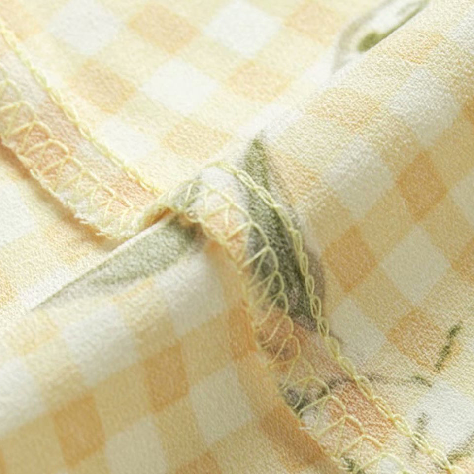 ●Design Feature:Garden Yellow Shirring Casual Plaid Floral Midi Dress