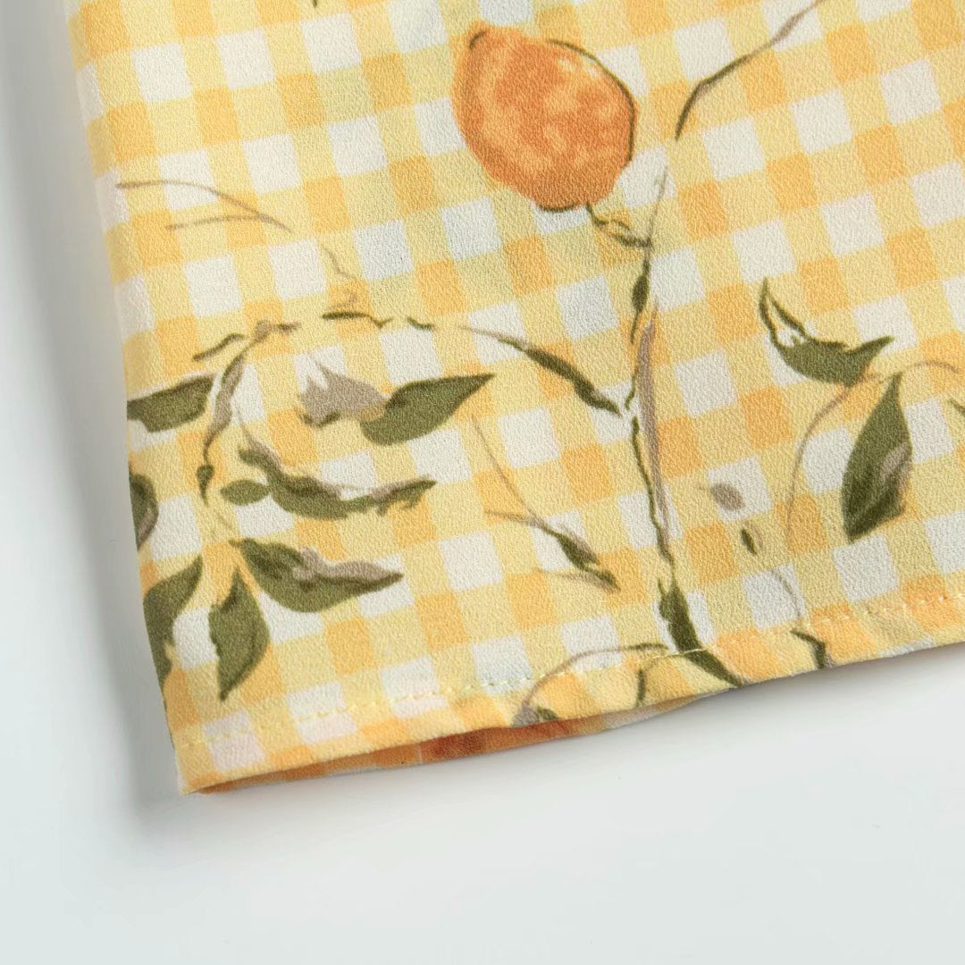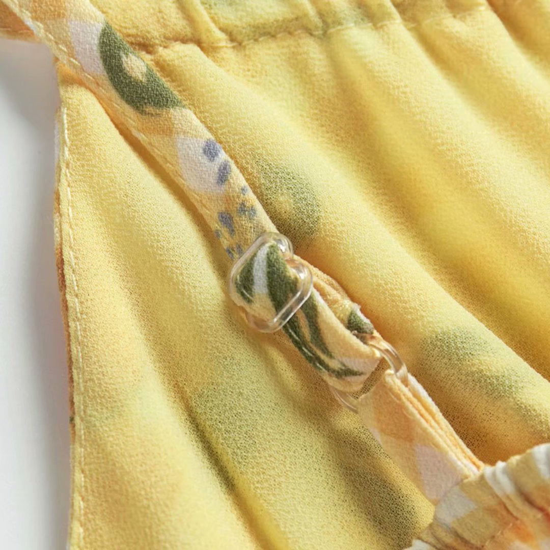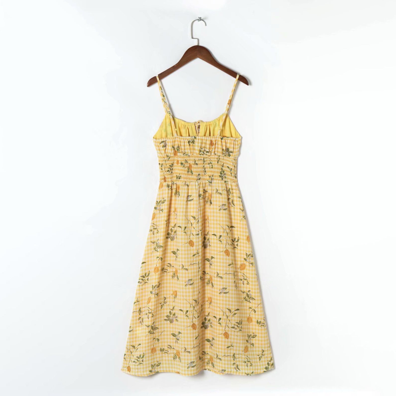 ●Design Feature:Garden Yellow Shirring Casual Plaid Floral Midi Dress