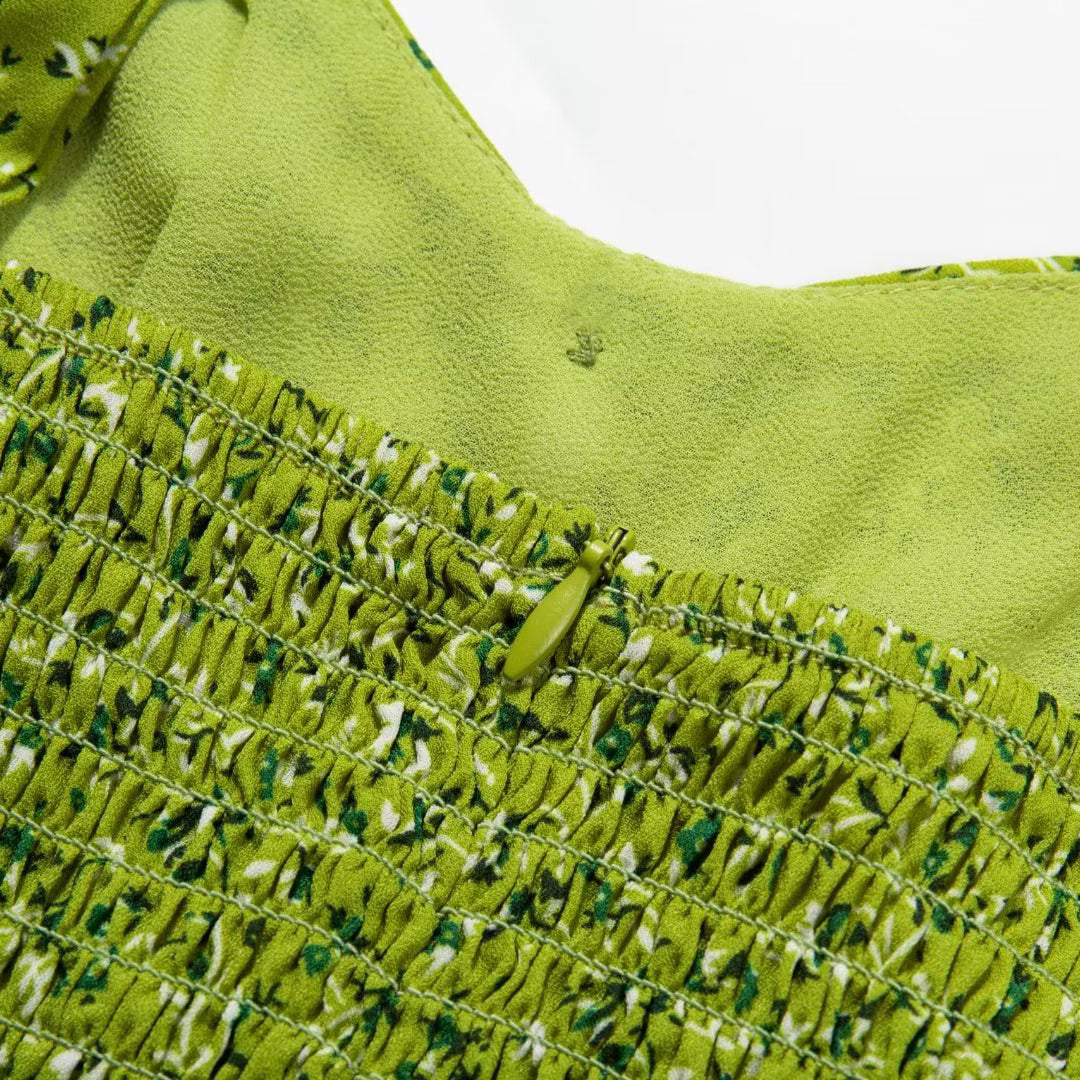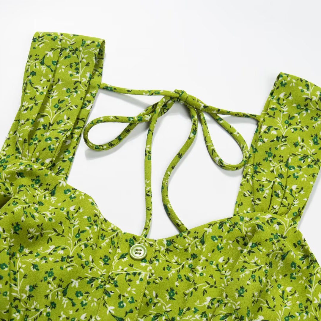 ●Design Feature:Green Sling Floral Printed Sleeveless Mini Dress