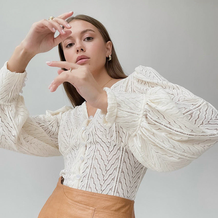 V-neck Puff Sleeve Shirt Lace Lantern Sleeve style C asual shirt